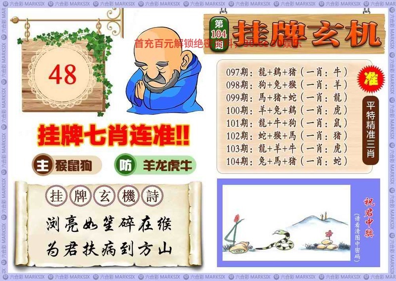 104期挂牌玄机:浏亮如笙碎在猴,为君扶病到方山 解:李煜因避祸隐居时创作此诗,以黄莺自喻,既暗含对宫廷斗争的畏惧,也流露对自身处境的悲叹。诗中“栖迟背世同悲鲁”进一步强化了与世隔绝、孤独苦闷的情感 六肖:蛇猪马兔狗鸡 |